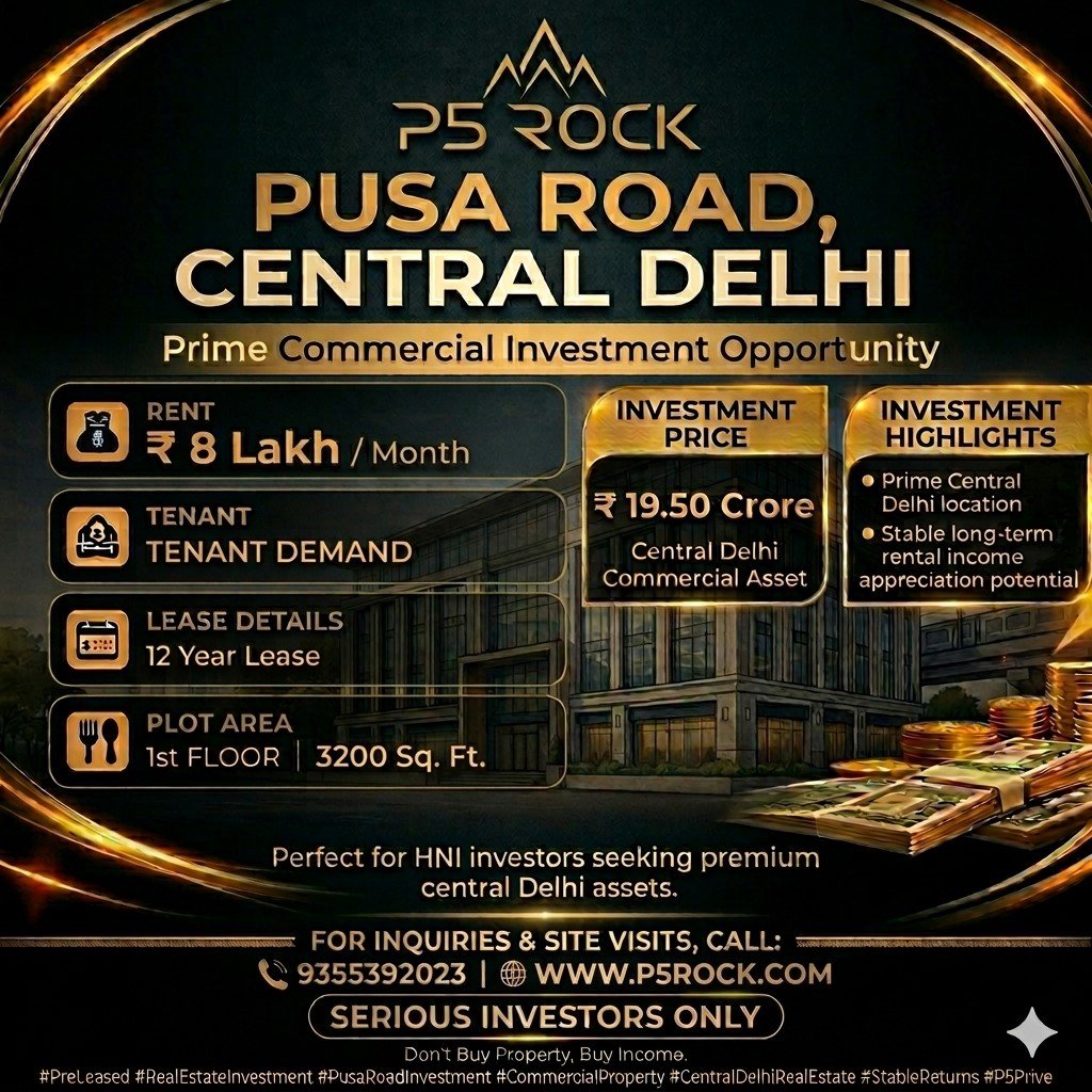 Property Overview: P5 Rock presents a rare opportunity to acquire a premium commercial space in the heart of Central Delhi. Located on the high-traffic Pusa Road, this ground-floor property is an ideal addition to any HNI investment portfolio. This asset combines the security of a long-term fresh lease with the high capital appreciation typical of Delhi’s most established commercial corridors.