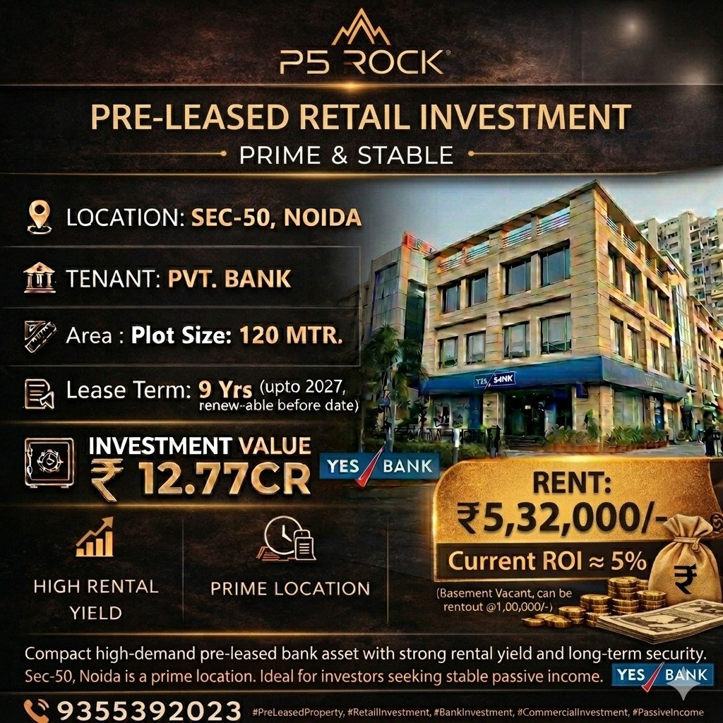 An exceptional opportunity to invest in a pre-leased commercial property leased to a reputed private bank. Located in the heart of Sector 50, Noida, this asset offers consistent rental income, strong tenant profile, and future appreciation potential.